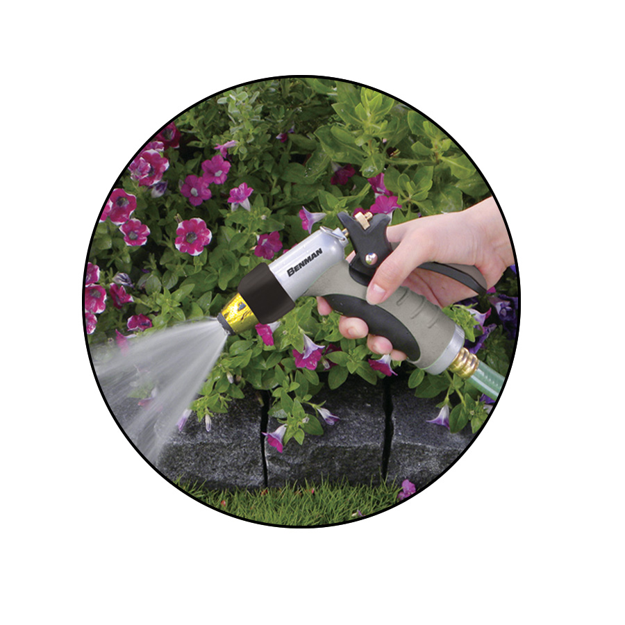 Ρυθμιζόμενο μεταλλικό πιστόλι ποτίσματος. Κατασκευάζεται από ενισχυμένη πρώτη ύλη, διαθέτει ινοπλισμένη σκανδάλη εργονομικά σχεδιασμένη, έχει εξαιρετικά μαλακή επίστρωση και υποδοχή ταχύ συνδέσμων τύπου universal. Η υποδοχή ταχυσυνδέσμου universal είναι συμβατή με τους περισσότερους ταχυσυνδέσμους.